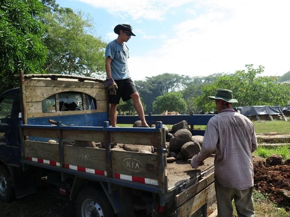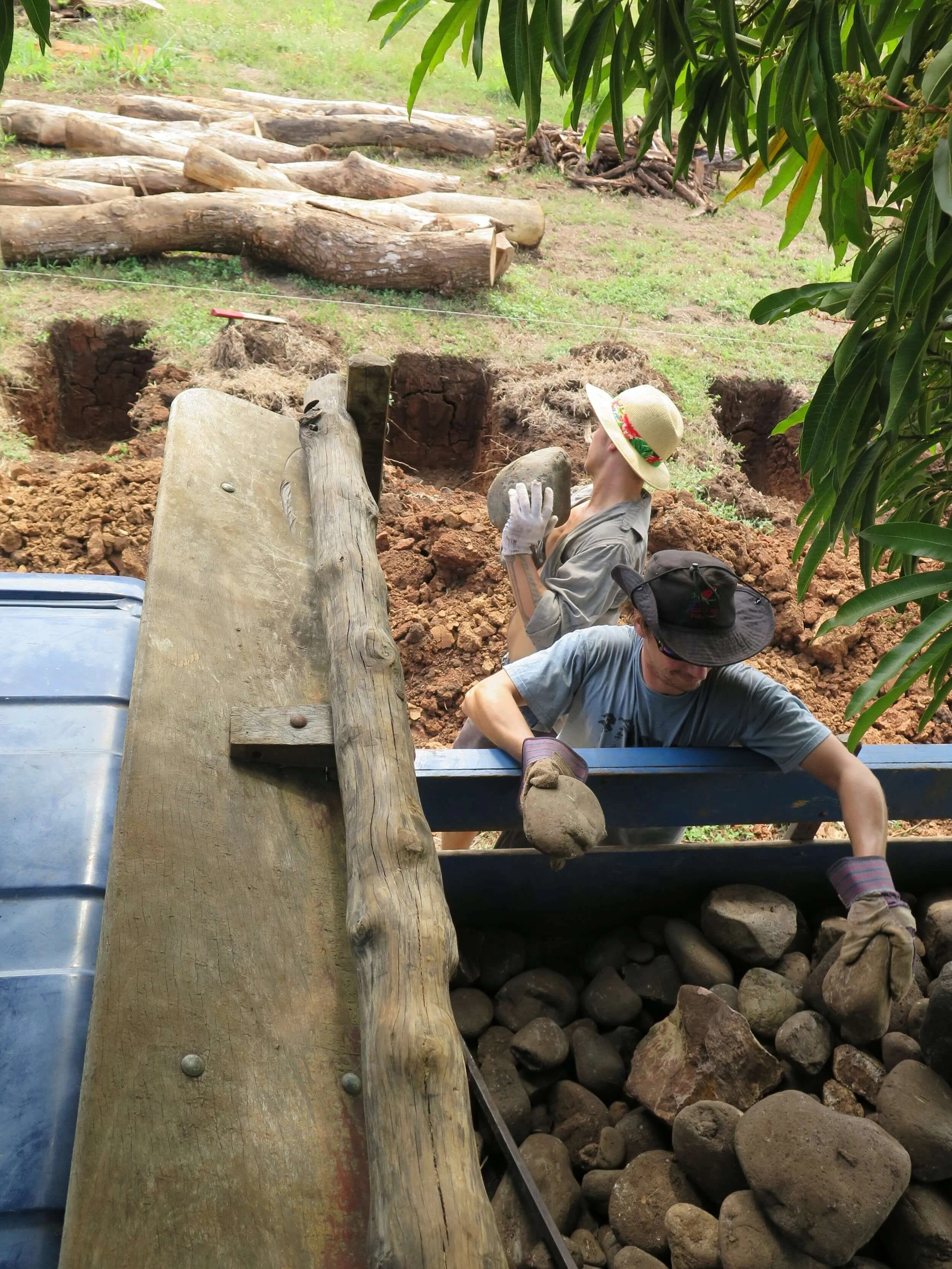 Xavier (foreground) and Graham load river rocks into the foundation holes. In the background you can see the posts of Spanish Cedar, which are all now securley in the ground, awaiting keel blocks.